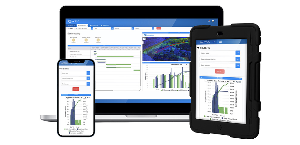 A Aptix automatiza e orquestra a distribuição de dados, incluindo arquivos de controle de máquina, modelos construíveis, cronogramas de projeto e relatórios sobre situações reais. Ela mostra, quase em tempo real, a localização de máquinas com a capacidade de agregar dados as-built proveniente da telemática de frota mista. A plataforma oferece relatórios em tempo real sobre pessoas, materiais, máquinas e emissões de dióxido de carbono, criando maior visibilidade para pegada de carbono e iniciativas de sustentabilidade.